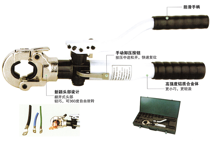 ■ C型鉗頭且可360度旋轉(zhuǎn),在完全壓接后自動(dòng)卸壓,必要時(shí)也可手動(dòng)卸壓;
